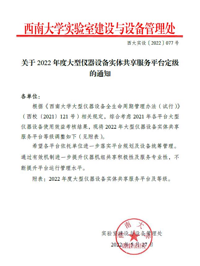 转发学校胜游体育2022年度大型仪器设备实体共享服务平台定级的通知