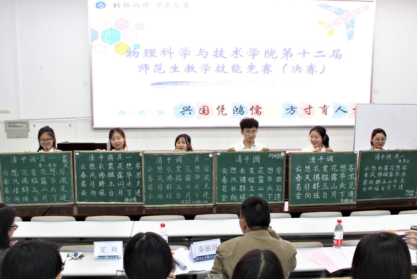 决赛分为课堂模拟教学和“三笔字”书写两个部分。在课堂模拟教学环节,选手依次上台进行2分钟的说课和10分钟的讲课。率先上场的选手是2018级师范1班的张毓浈同学,她设立“三人扔球比赛”的具体情景引入课题,通过形象的单摆实验条理清晰地讲解了机械能守恒定律;讲授同一课题、第二个登场的2018级师范3班杨文倩同学教态亲切自然,以瀑布的实例引导观众思考“能量是如何转换的”这一问题,进而讲解了“机械能是由动能和势能组成的”。2017级师范1班程育彦同学课堂构思巧妙,以“150斤的小明为什么不能坐旋转秋千”这一问题引出向心力的概念,将课程内容和生活实际有机联系;讲授同一课题的2017级师范2班刘明朗同学通过演示多个与向心力相关的小魔术和小实验,强调“物理是基于实验和观察的学科”。2017级师范4班马璐瑶同学采用控制变量法,改变时间等多个变量演示法拉第电磁感应定律实验,推导出法拉第电感应定律的影响因素。最后上场的2017级师范3班罗秋悦同学,教态亲切自然,语调抑扬顿挫,在授课过程中善于引导同学们进行思考,辅助手摇发电机等对比实验引出课题,清晰透彻地讲解了法拉第电磁感应定律。