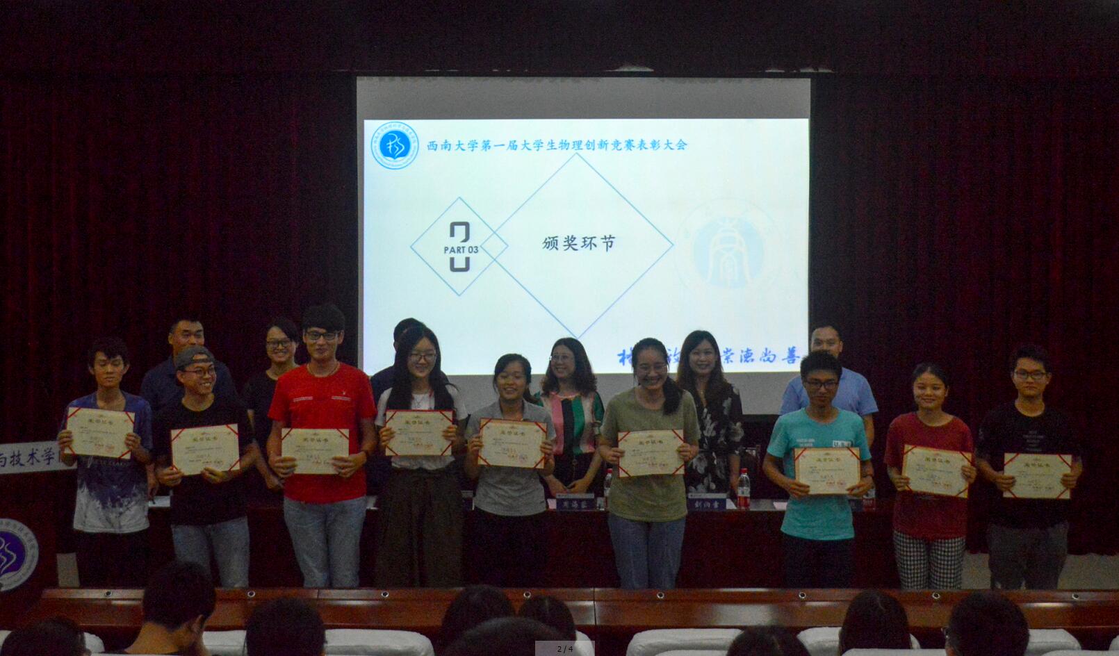 为表彰学术科技先进,营造良好的学风建设氛围,6月21日下午,西南大学第一届大学生物理创新竞赛暨胜游体育(中国)官方在线第四届“尚学杯”学术科技文化节表彰大会在物理大楼小阶梯教室召开。胜游体育(中国)官方在线副院长袁宏宽、党委副书记刘汭雪,西南大学创新创业胜游体育(中国)官方在线副院长周海蓉,胜游体育(中国)官方在线高级实验师谭兴文、2015级辅导员王彪,以及胜游体育(中国)官方在线创新团队成员、科普社成员、参赛学生代表共计100余人参加表彰活动。大会由团委书记贺颖主持。