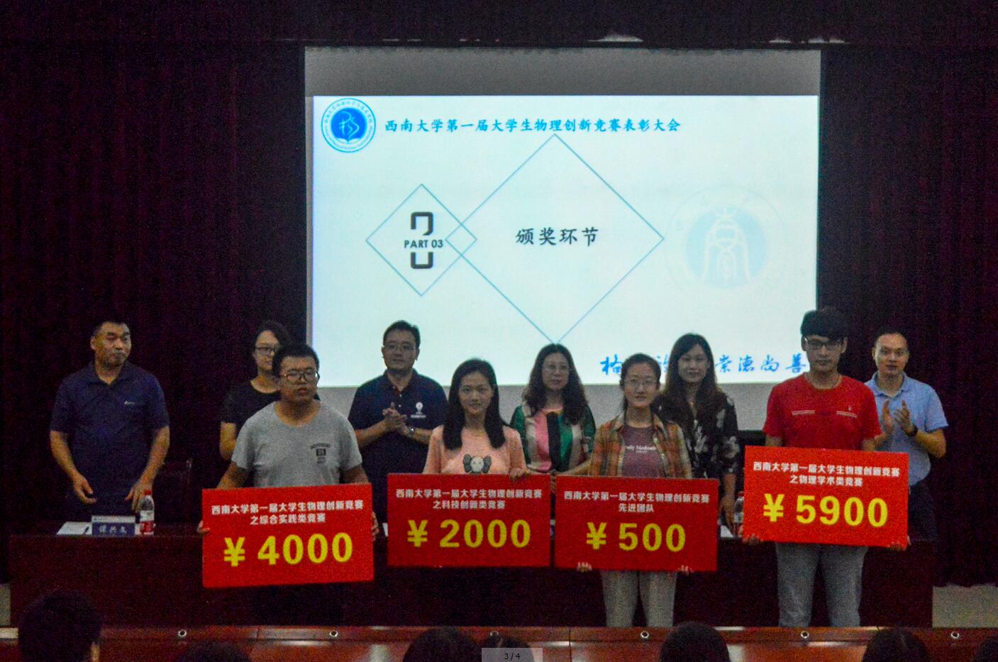 集体观看大赛回顾视频后,袁宏宽副院长对竞赛组织情况进行了总结。他指出,西南大学第一届大学生物理创新竞赛由创新创业胜游体育(中国)官方在线、物理科学与技术胜游体育(中国)官方在线联合承办,设置综合实践类、物理学术类、科技创新类三大竞赛。历时3个月, 330人次参赛,评选各类奖项和先进个人170人次。他肯定了参赛同学的精彩表现,希望同学们树立报效国家的科学理想,保持探究与合作的科学兴趣。党委副书记刘汭雪宣读了竞赛表彰决定,与会嘉宾为大赛获奖选手、先进团队和先进个人颁发证书和奖金,累计发放各类别奖金12400元。