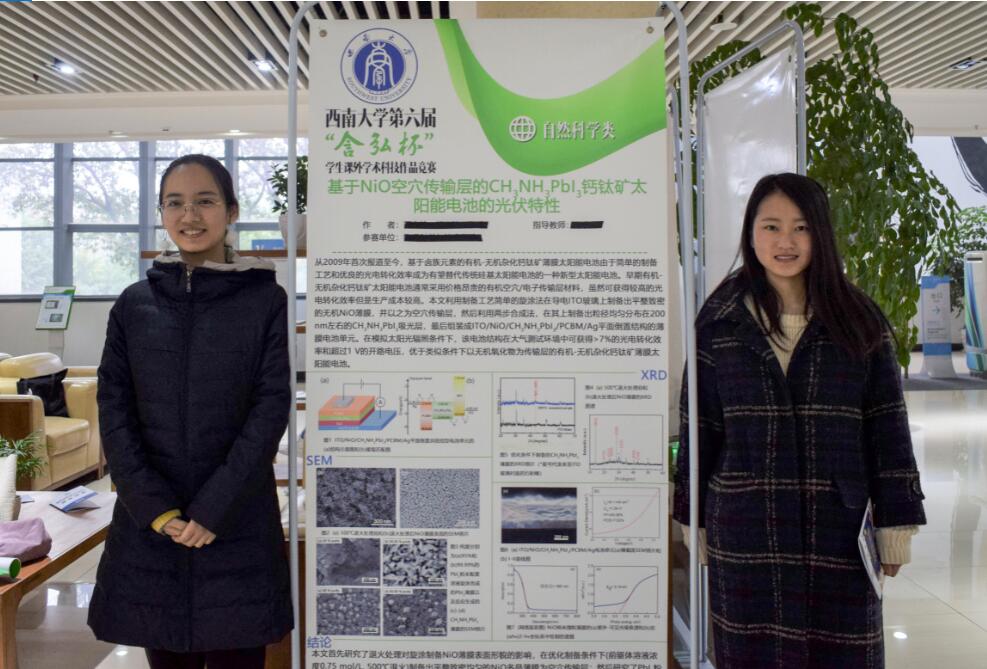 12月16日,学校第六届“含弘杯”学生课外学术科技作品竞赛终审决赛在中心图书馆落下帷幕。2015级普师班翟文静、邢玉陟、张叶同学的参赛作品《基于NiO空穴传输层的CH3NH3PbI3钙钛矿太阳能电池的光伏特性》斩获自然科学类一等奖,2015级师范班邹华、张蕊、宋昱儒同学的参赛作品《钴镍钼复合电极材料的合成及其超级电容性能研究》荣获优秀奖。